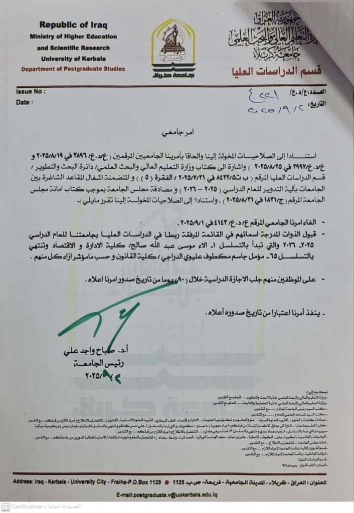 تعلن جامعة كربلاء عن الاسماء المقبولين بآلية التدوير بين الجامعات للعام الدراسي 2025 ــ 2026 على ان تكون مباشرتهم اسوةً باقرانهم حسب الضوابط والتعليمات.