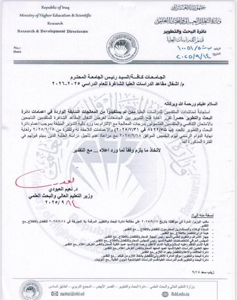 قررت وزارة التعليم العالي والبحث العلمي باعادة فتح التدوير بين الجامعات لغرض اشغال المقاعد الشاغرة للمتقدمين الناجحين بالامتحان التنافسي والمتقدمين المشمولين بدرجات المعالجة مع الالتزام بما ورد بآلية التدوير السابقة وللفترة من 2025/9/15 ولغاية نهاية الدوام الرسمي ليوم الخميس الموافق 2025/9/18.
