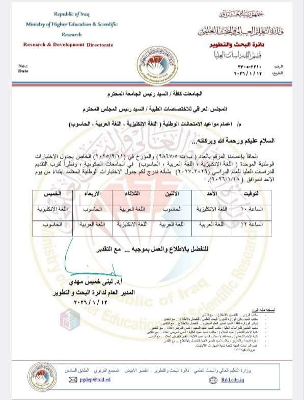 المواعيد الجديدة للاختبارات الوطنية ابتداءً من تأريخ 2026/1/18.