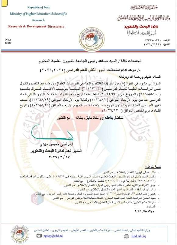 وزارة التعليم العالي والبحث العلمي تجري تعديلاً على التقويم السنوي الدراسي يتعلق بموعد اداء امتحانات الدور الثاني .